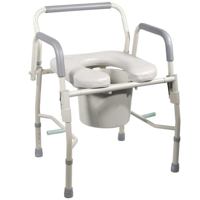 The Deluxe Steel Drop Arm Commode features an innovative knock-down frame with a padded, open-front vinyl toilet seat. It is designed to maintain sanitation while increasing convenience as a mobility aid. The bariatric commode is ideal for individuals who are recovering from surgery or who have a limited range of motion. The commode chair can be used as a bedside toilet safety frame or raised toilet seat, shortening the distance between the bed and the bathroom.